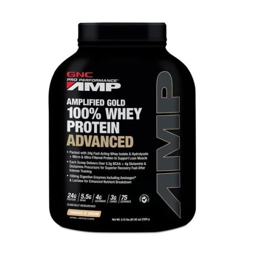 GNC AMP Amplified Gold 100% Whey Protein Advanced یک مکمل پروتئینی است که حاوی ۲۴ گرم پروتئین وی ایزوله سریع‌الاثر و پپتیدهای هیدرولیز شده به همراه کنسانتره پروتئین وی می‌باشد، که برای حمایت از عضلات بدون چربی طراحی شده است. این محصول با بیش از ۵ گرم آمینو اسیدهای شاخه‌دار (BCAA) غنی شده که به بهبود ریکاوری عضلات پس از تمرین و رشد عضلانی کمک می‌کند.